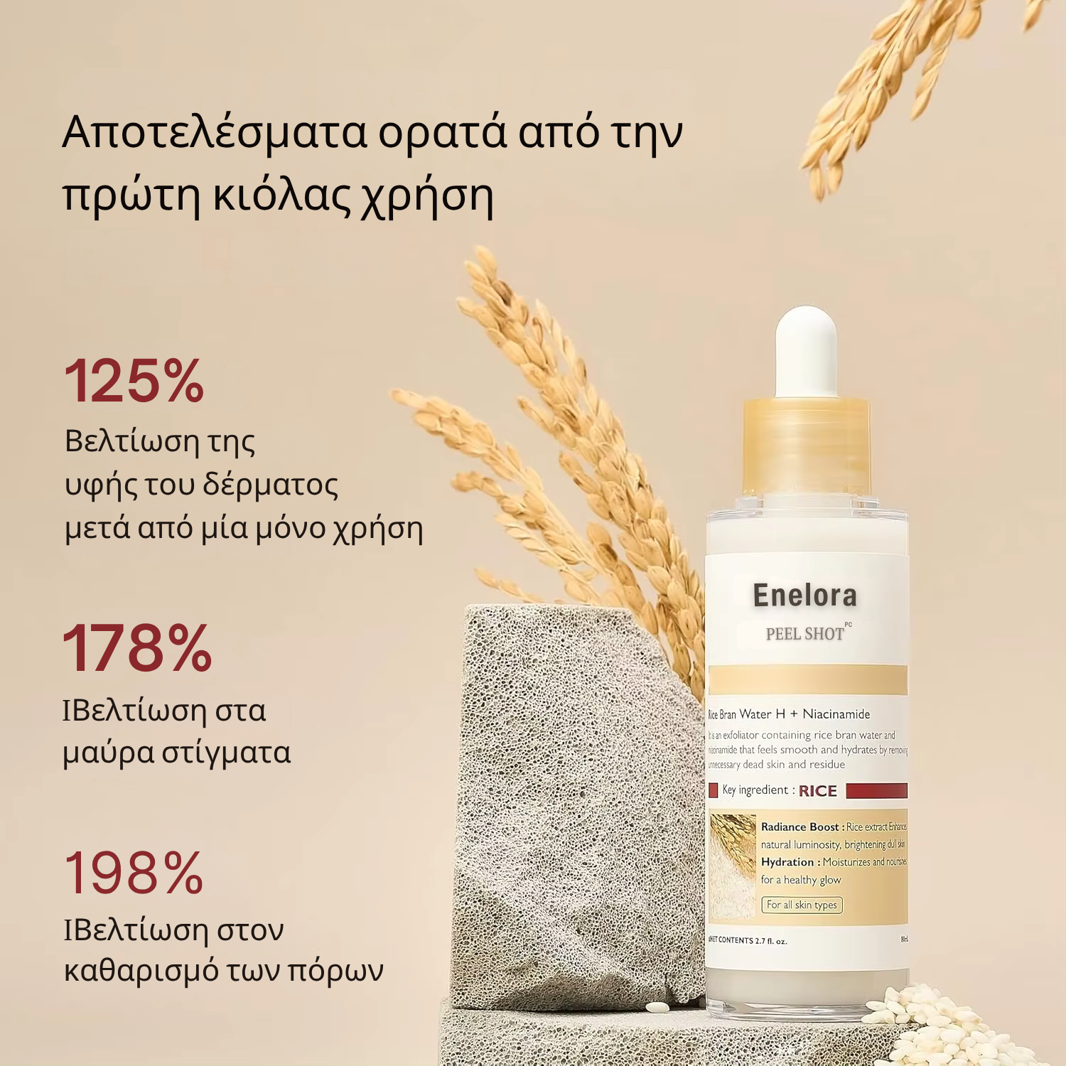 🌾 Σύμπλεγμα Λευκού Ρυζιού (ζύμωση) – ήπια ενζυμική απολέπιση, ενεργοποίηση ανανέωσης και φυσική λάμψη.